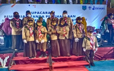 Sebanyak 11 siswa-siswi SDN 21 Muntik yang tergabung dalam Pramuka Garuda Kwartir Cabang Bangka Barat menghadiri Upacara Pemberian Tand